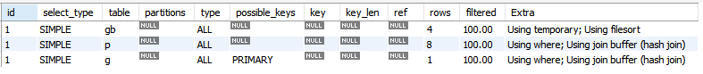 지금은 모든 테이블이 인덱스를 사용하지 않고 풀 테이블 스캔을 사용하여 탐색하고 있습니다.