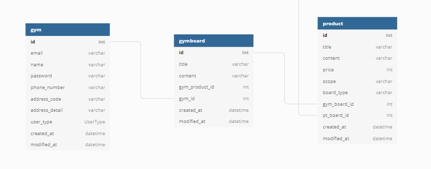 gymboard 테이블과 gym 테이블의 관계는 1 : 1입니다. 그리고 gymboard 테이블과 product 테이블의 관계는 1 : N 입니다. 그래서 하나의 gymboard 레코드에는 하나 이상의 product 레코드가 매칭되어 있습니다.
