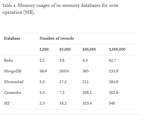 Redis가 Write하는 속도는 Memcached에 비해 느리지만 각 Read와 Write연산을 수행할 때의 메모리 사용량을 보면 Memcached에 비해 효율적임을 알 수 있습니다.